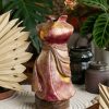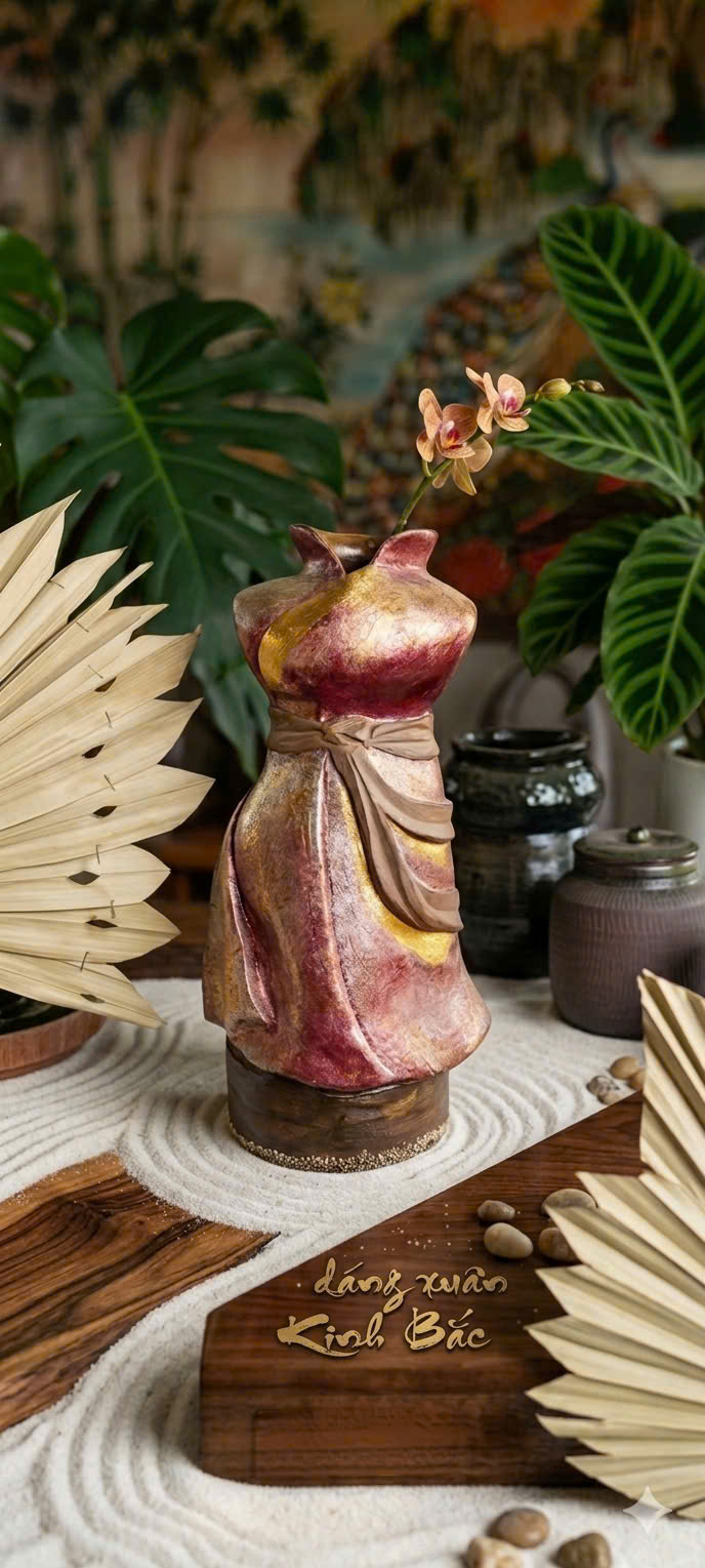 Dáng Xuân Kinh Bắc – Vũ điệu di sản trên gốm sành Khơi nguồn từ hồn cốt Kinh Bắc, Dáng Xuân không chỉ là một lọ hoa, mà là một bức họa sống động tái hiện hình tượng người con gái Quan họ duyên dáng. Tuyệt tác tạo hình: Thân bình được cách điệu đầy nghệ thuật từ tà áo tứ thân và dải yếm đào lả lướt, mang trọn nét xuân thì mềm mại và khí chất kiêu sa của vùng đất “văn nhân, nghĩa sĩ”. Tinh hoa chất liệu: Sự giao thoa hoàn mỹ giữa cốt gốm sành đất sét hồng Cung Kiệm quý hiếm và lớp men hữu cơ cổ truyền đời. Kỹ thuật sơn mài thủ công tạo nên những vệt màu đỏ tía, vàng đồng sâu thẳm, rực rỡ như ráng chiều trên dòng sông Cầu. Giá trị di sản: Mỗi tác phẩm là một lời kể về niềm tự hào văn hóa, mang năng lượng phong thủy ấm cúng của hành Thổ và Mộc. Khi kết hợp cùng hoa Thiên Điểu vươn cao, “Dáng Xuân” trở thành biểu tượng cho sự tự do, khát vọng và cốt cách thanh cao của người Việt. Một món quà tặng tâm giao, gói trọn phong thái lịch lãm và giá trị văn hóa độc bản dành cho những người trân quý tinh hoa nghệ thuật.